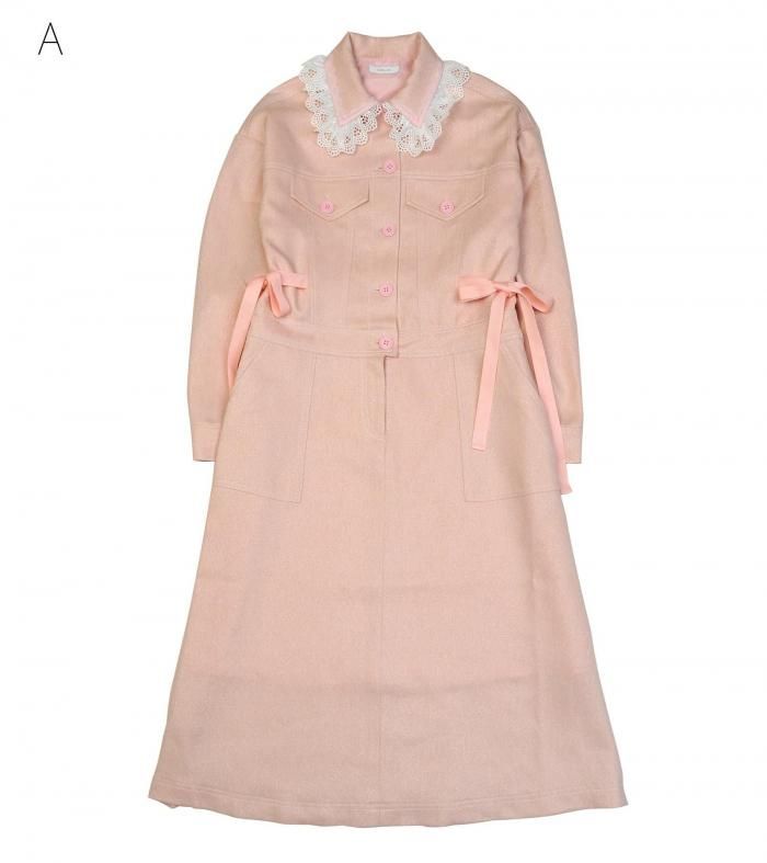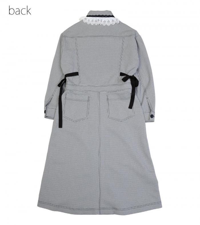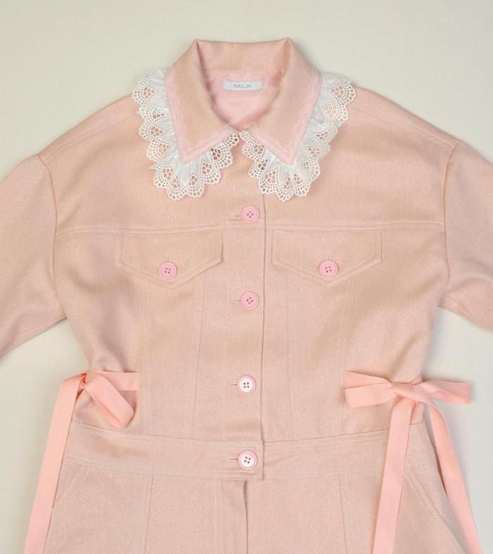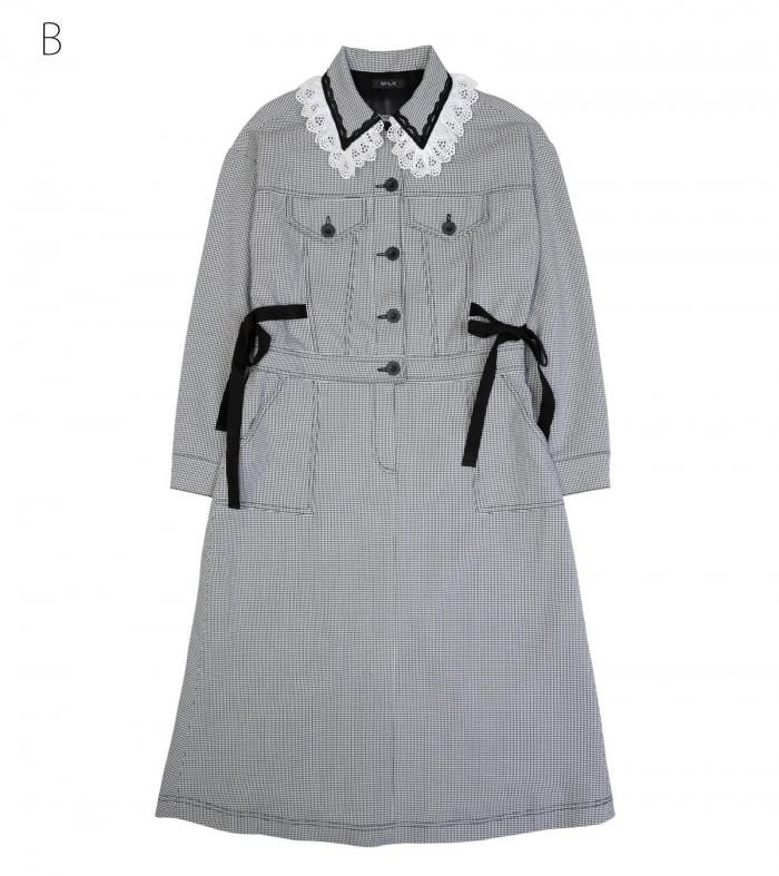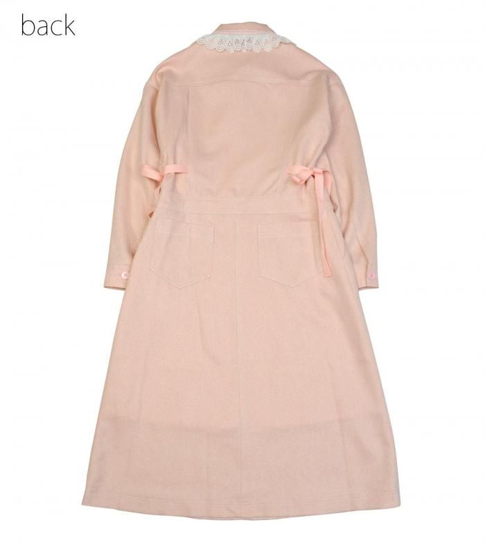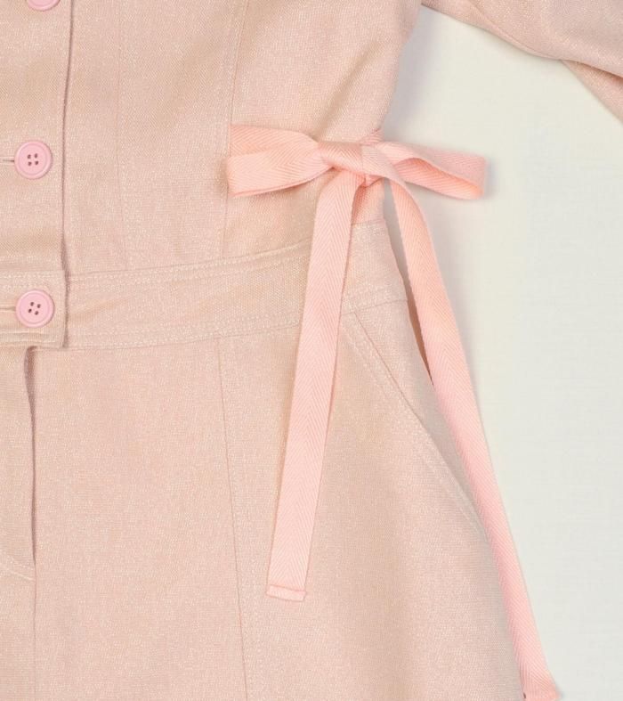 つなぎ風のデザインに、襟のレースとウエストのリボンを効かせた華やかなワンピース
