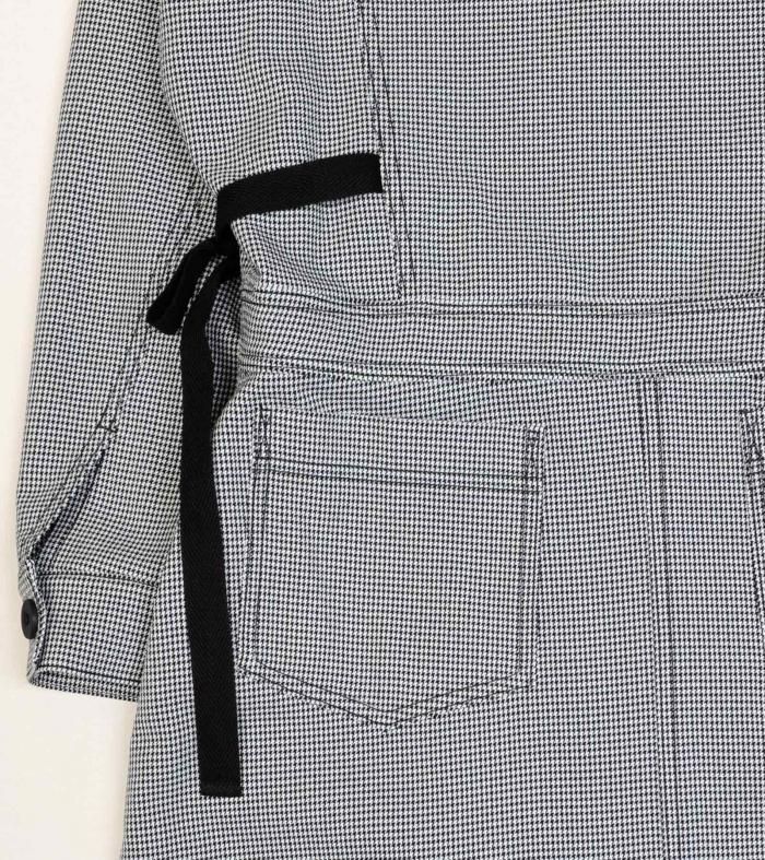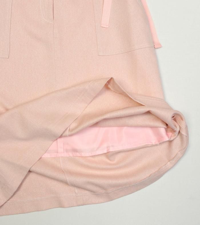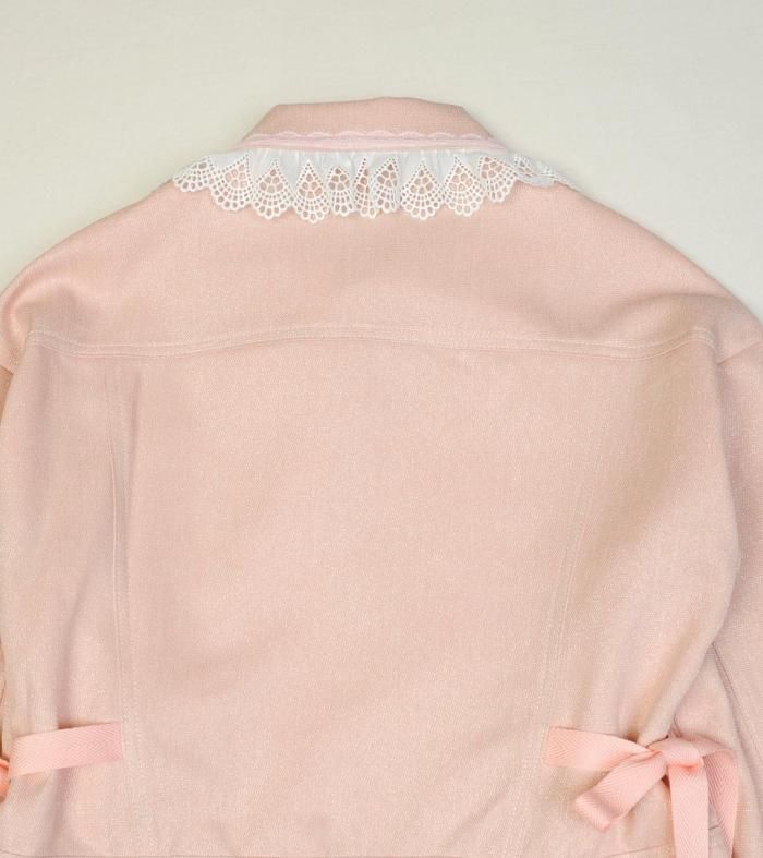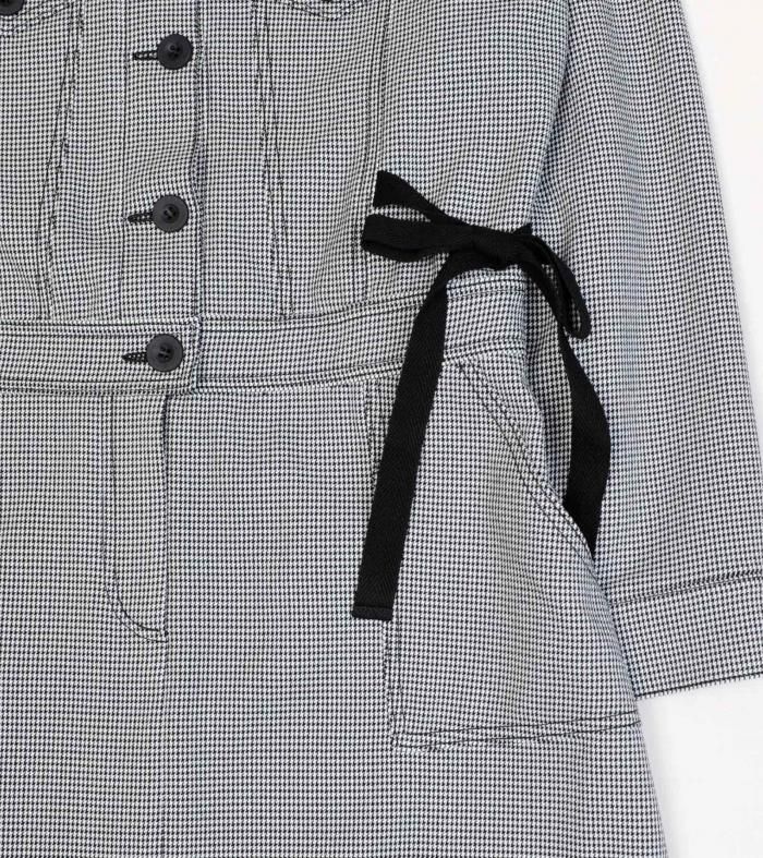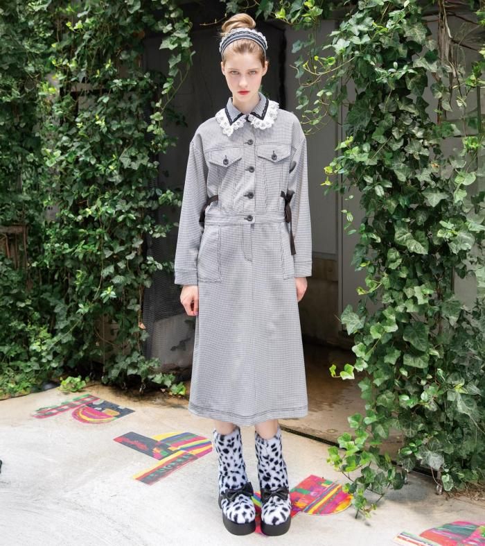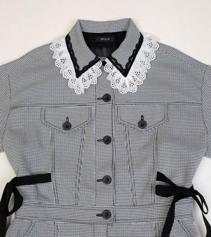 つなぎ風のデザインに、襟のレースとウエストのリボンを効かせた華やかなワンピース