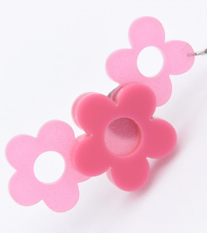 軟骨カフとビーズチェーンでつながった3つのお花が耳たぶに沿って並ぶイヤリング