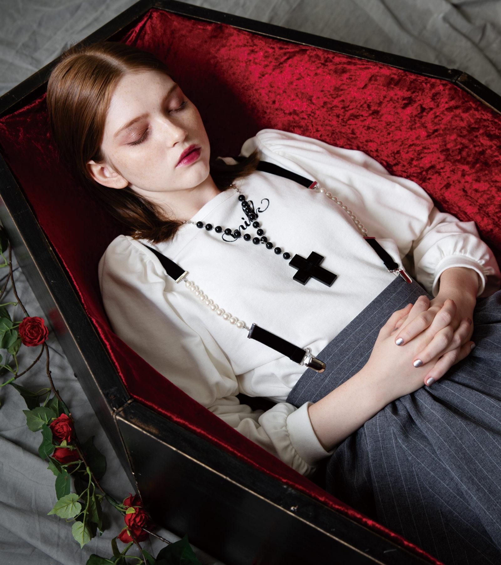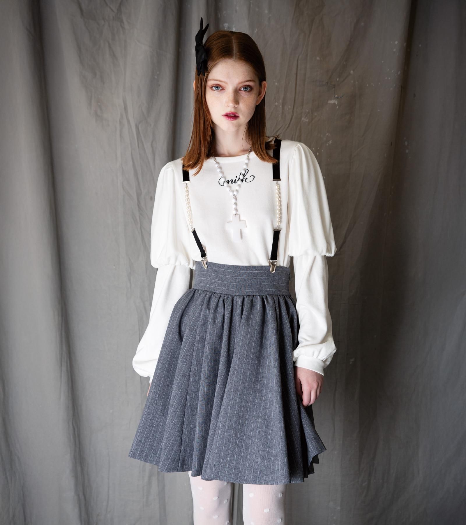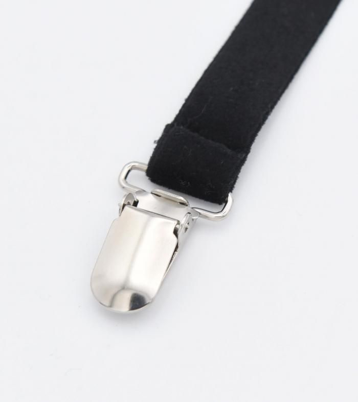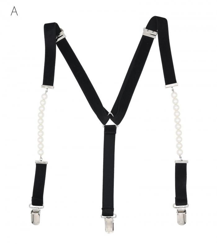 ストレッチベロアテープとパールチェーンが華やかで、ハーネスのようなデザインのサスペンダー
