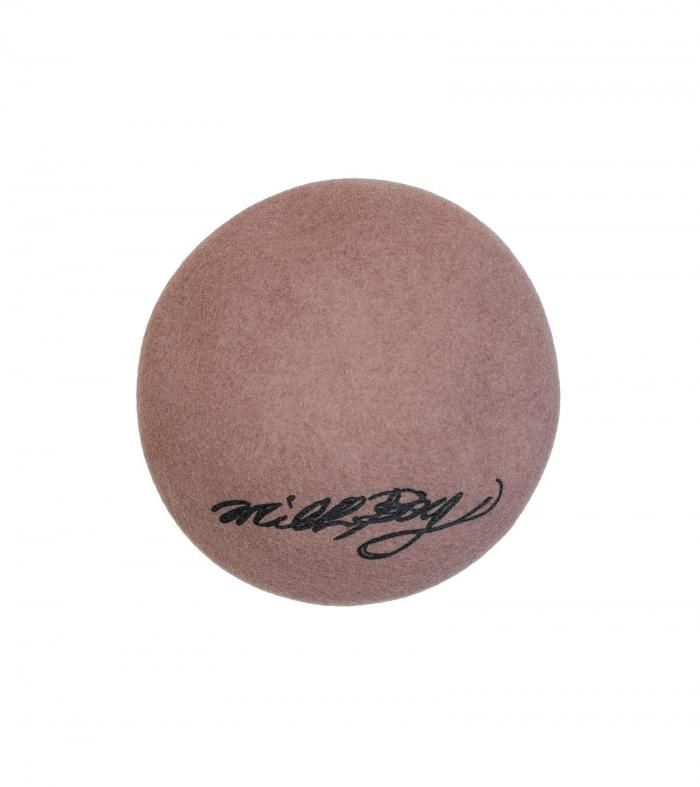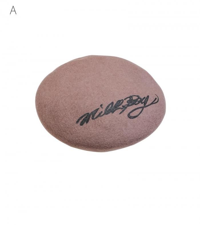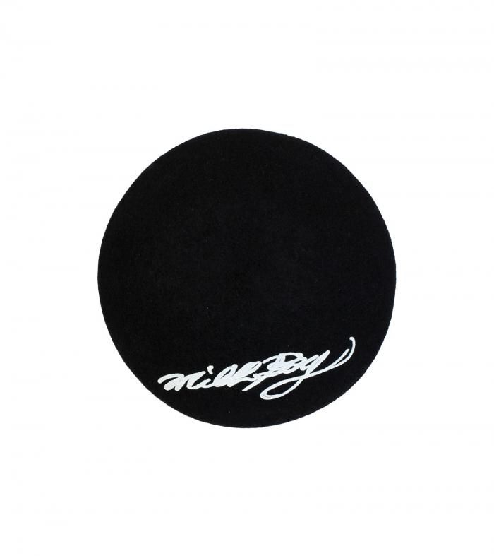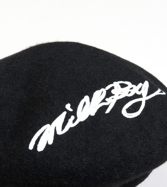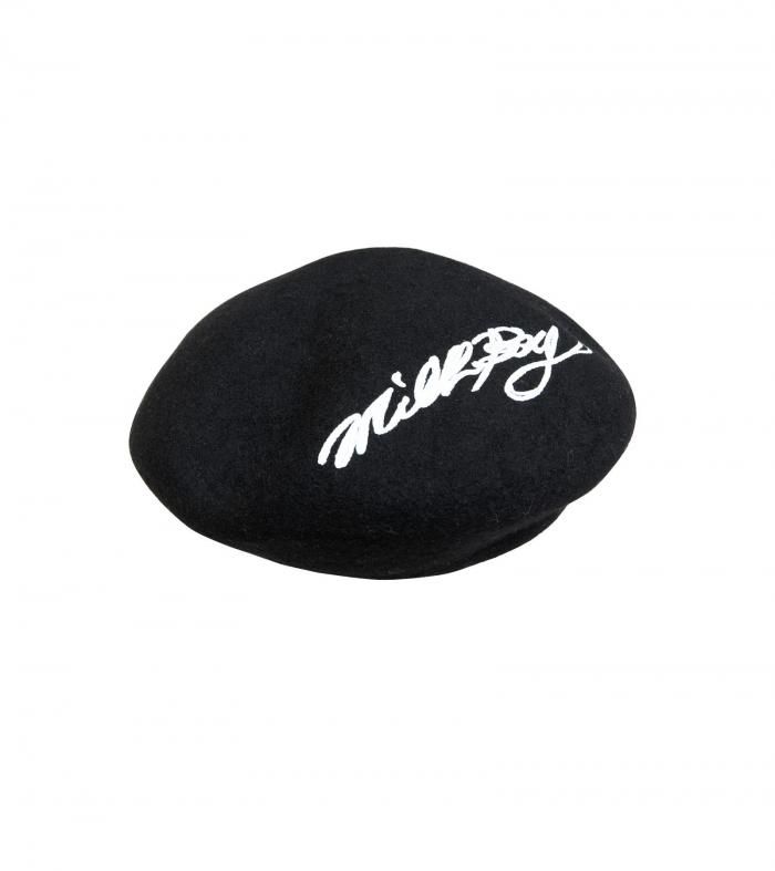 MILKBOY定番のベレー帽、今シーズンは筆記体のロゴプリント入り