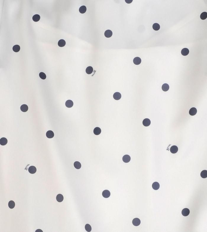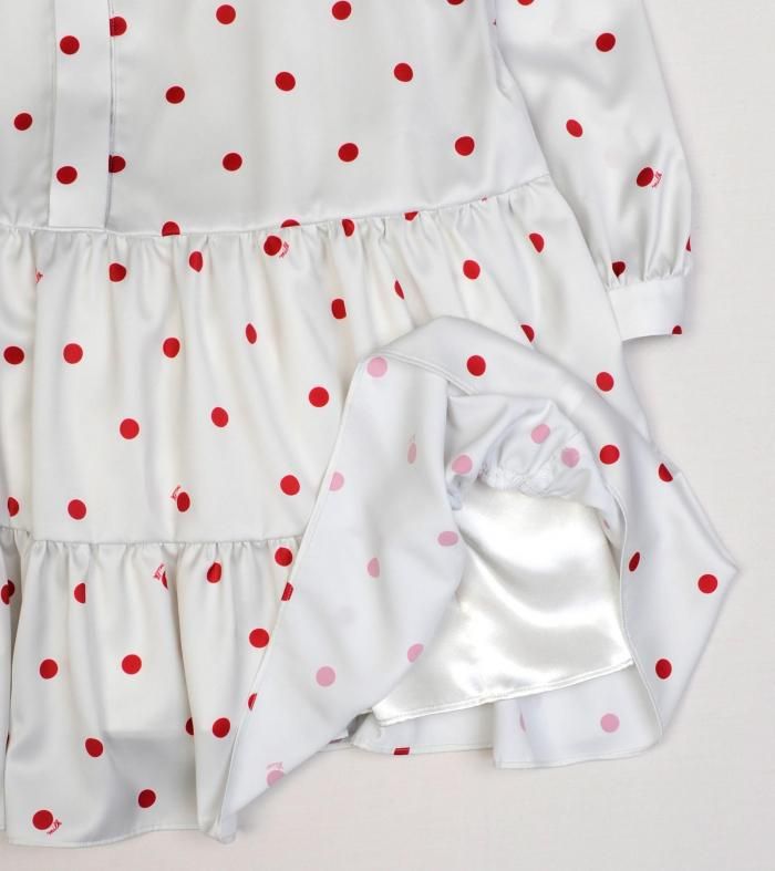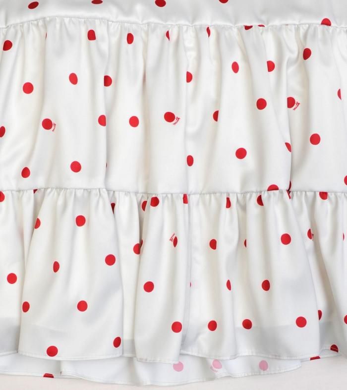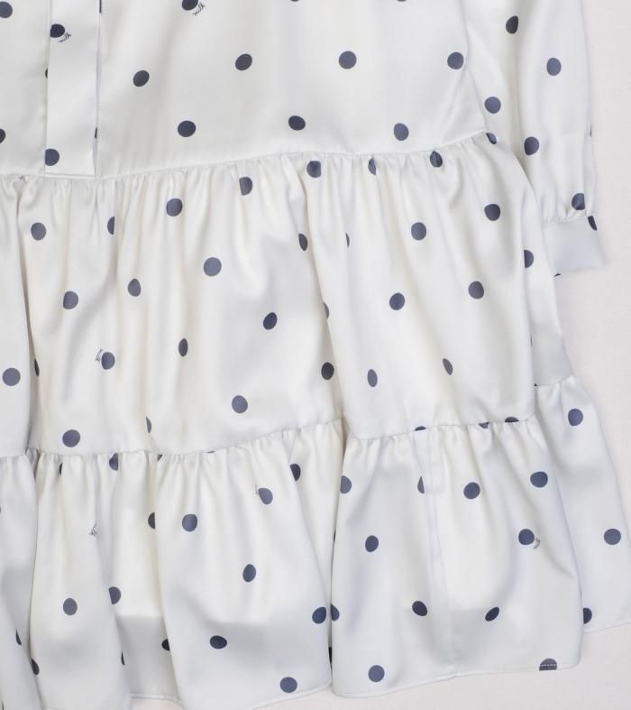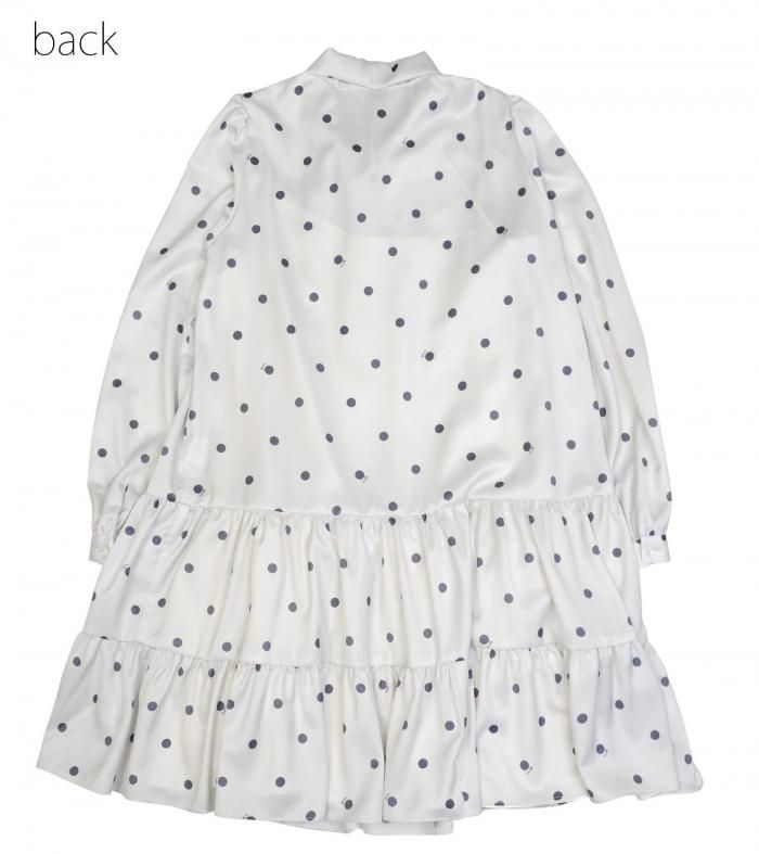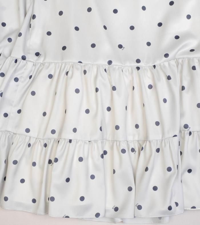 オリジナルロゴ入りのドット生地を使用したティアードワンピース