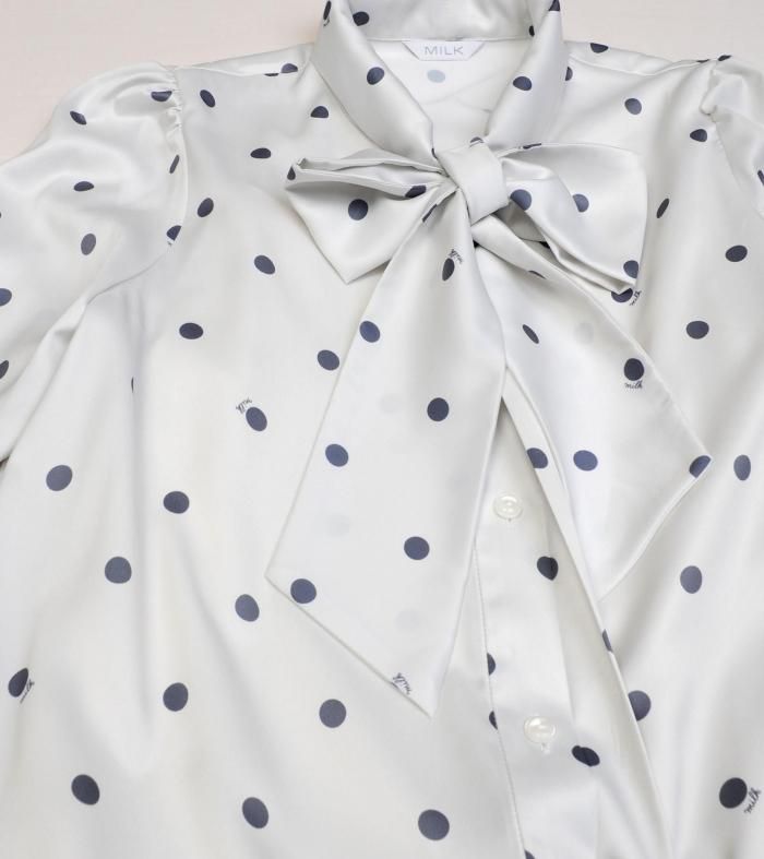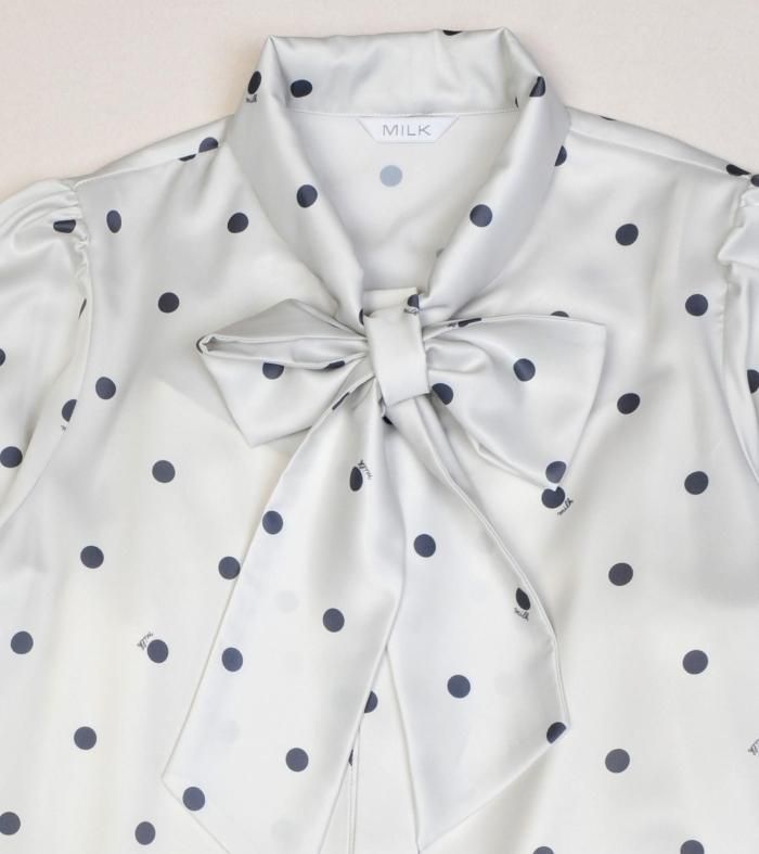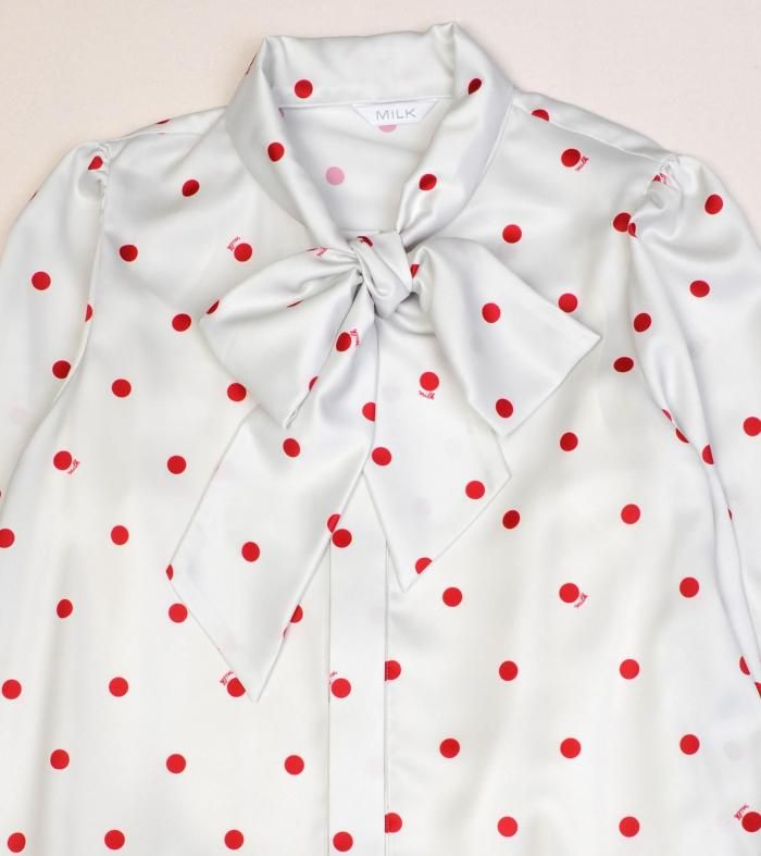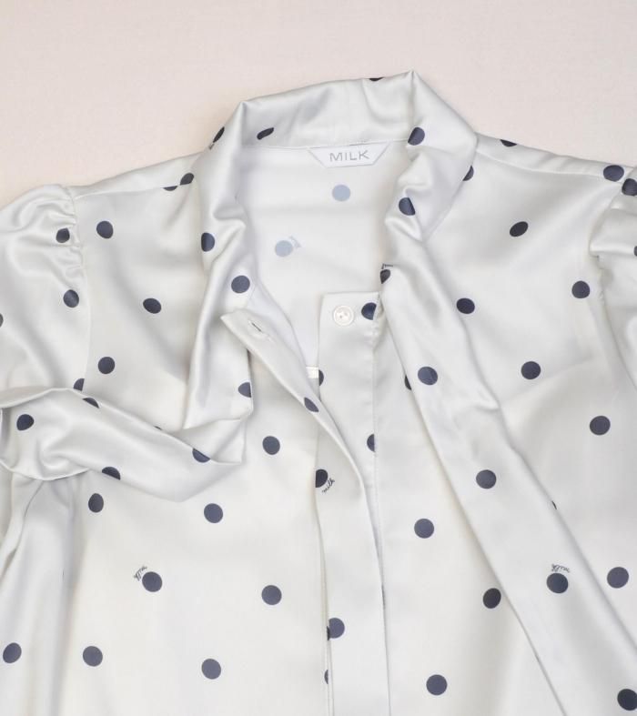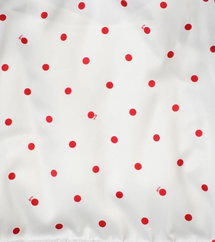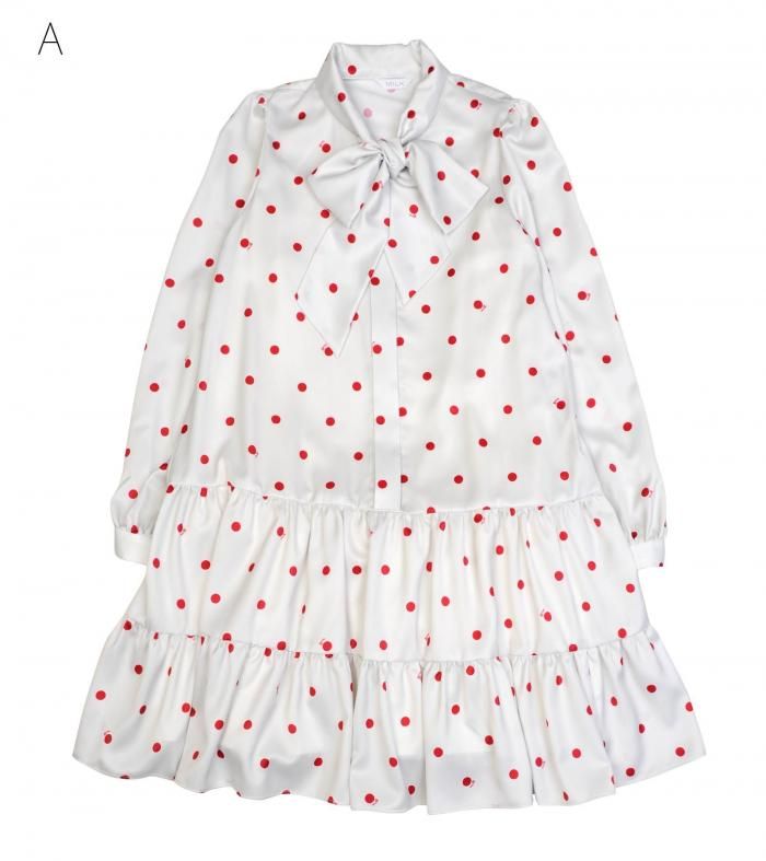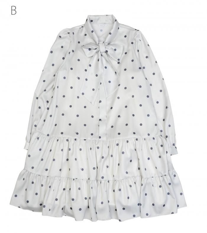オリジナルロゴ入りのドット生地を使用したティアードワンピース