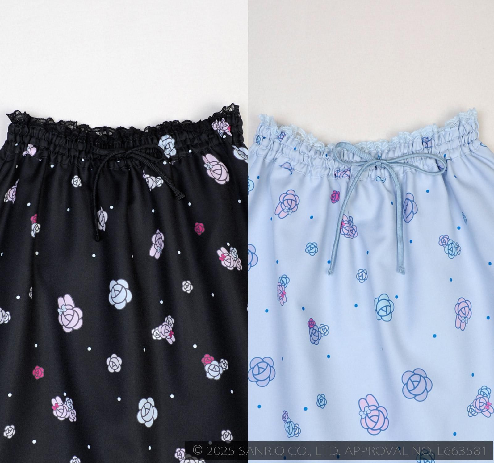 まるでおとぎ話の庭園を散歩しているような、ポップで愛らしいバラの花を散りばめたオリジナルプリントが広がるロングスカート♡