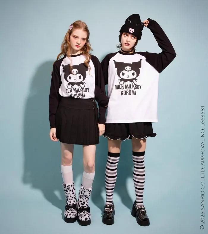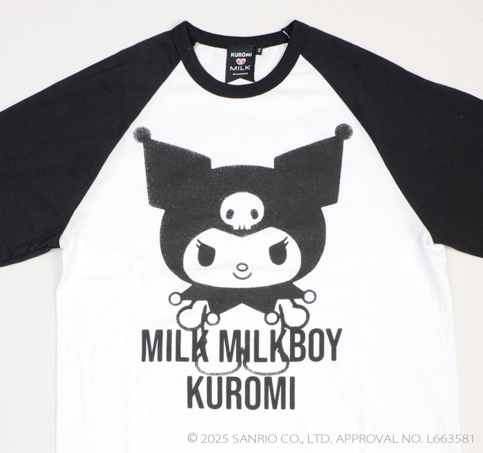 フロント全体に大きくプリントされたクロミと、KUROMI・MILK・MILKBOYの3つのネームロゴがポイントのラグランスリーブロングスリーブTEE
