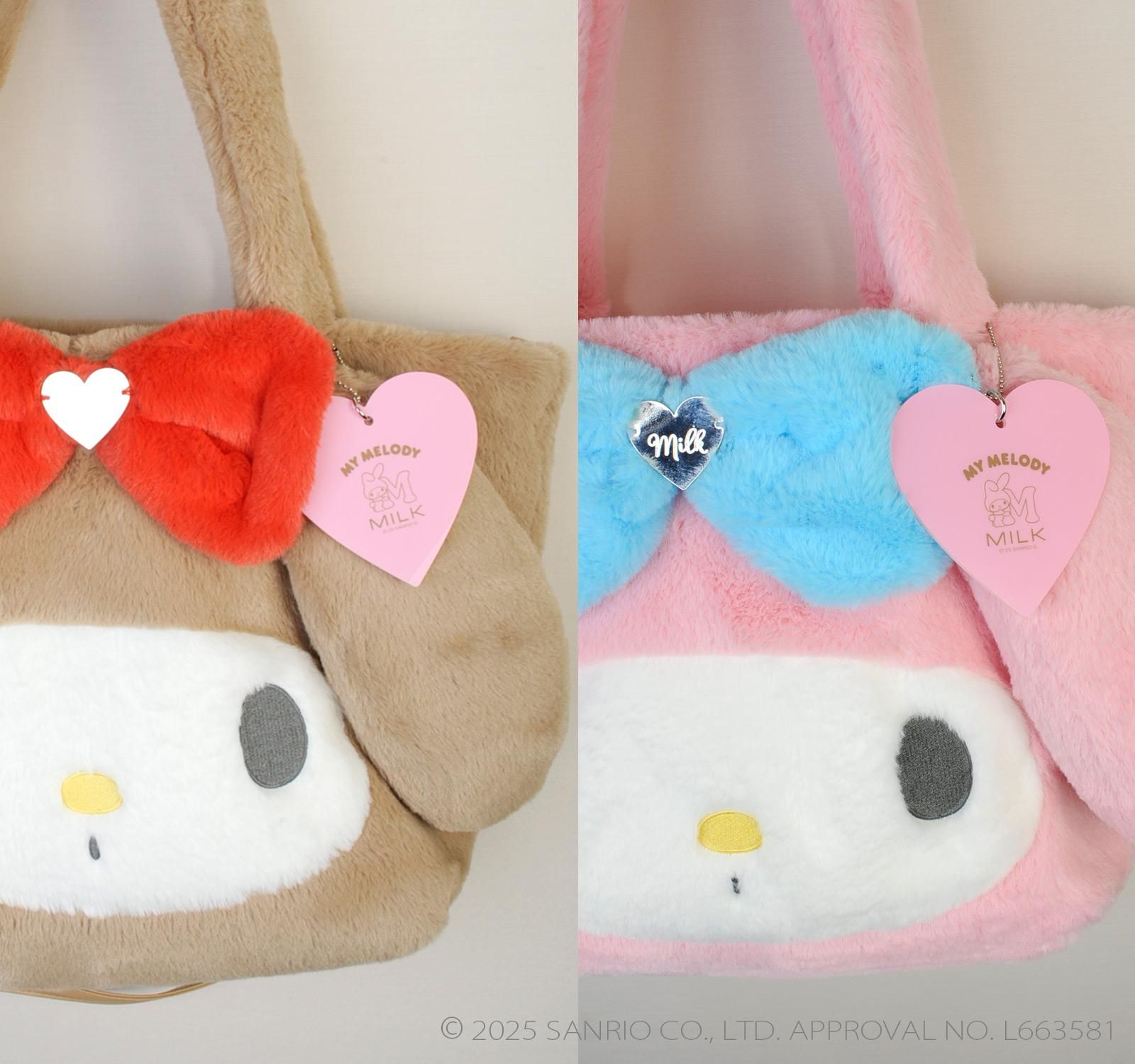 リボンにはMILKのロゴ入りハートプレートをあしらい、チャームにはマイメロディとピアノちゃんがプリントされたハート型アクリルチャームが付属