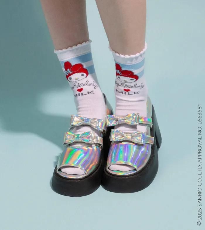 マイメロディの顔とコラボロゴをあしらったスポーツソックス。